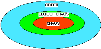 We aim to illustrate that this characterization of these three regimes appears to be the underlying process structure of the increasing material complexity of existence. Abstractly, each level of complexity has three basic regions as depicted in Figure 2a: the chaotic region, the order region, and the edge between the chaotic and order region. Figure 2b depicts the major level of complexity 2 in terms of these three regions. The chaotic region of a level of complexity supplies the evolutionary energy for the growth of an "edge of chaos" for the next level of complexity. The order region is the "material" area for storage of dynamic structures that were created by the process at the edge of chaos. The order region largely preserves the information at a level of complexity in these dynamic structures. But in addition, these structures in the order region can be fedback into the edge of chaos by energy fluctuations created by the turbulence of the chaotic region into the dynamic structures of the order region. Another simple metaphor to visualize the level of complexity, is view each level centered on a conceptual form of equilibrium in time and space, even though there is no such thing as an equilibrium in reality. The massive equilibrium, which is not exactly in equilibrium replicates and dissipates from that time and space center.