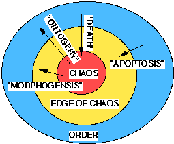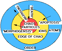 Another view of a level of material complexity is the characterization of the phases of dynamic organization of microsystems. Figure 4a represents a phase space of a level of material complexity. Figure 4b represents the major level of material complexity 2. The morphogenesis of simpler entities into a dynamic structure represent the phase change from chaos to order. For the complexity level 2, the morphogenesis is from particles to atomic nuclei. The growth from nuclear ion to atom by capturing electrons represents the phase change from the edge of chaos to order. The concepts of "death," "ontogeny," "morphogenesis," "apoptosis" are suitably generalize to include non-life phenomena.
