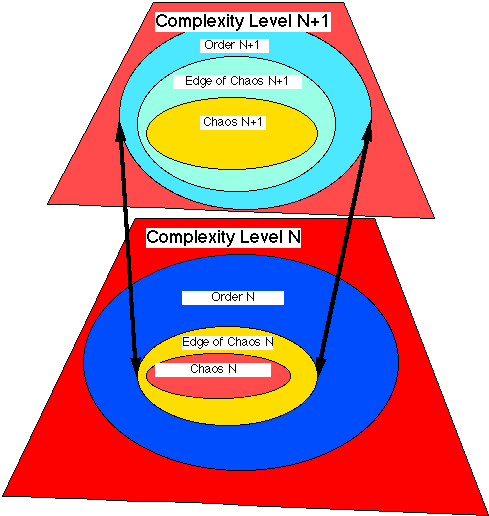 Figure 6 illustrates the arising of the next level of material complexity from the level below. The edge of chaos region N-1 contains the chaotic region N. The illustration is conceptual, because the next higher level of material complexity is physically contained in the lower level of material complexity. Moreover, the region between order and chaos, "the edge of chaos," is a not physically continuous region, and the edge of chaos is very small compared to the order and chaotic regions. ("The edge of chaos" is probably approximately 10-7 smaller in mass-energy than the chaos region, and approximately 10-7 smaller in space-time than the order-region.)
