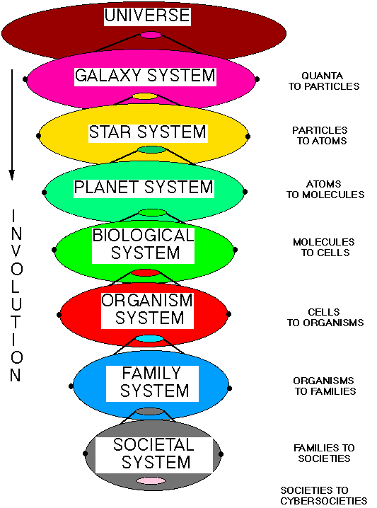 Figure 3 represents the current involution path of our existence, with the successive higher level macrosystems being a smaller and smaller part of the larger context in space, time, energy, and matter.